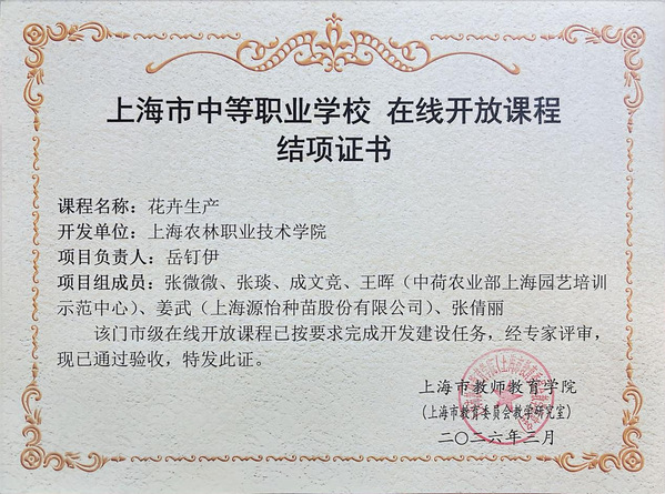 近日,上海市教师教育学院(上海市教育委员会教学研究室)发布《关于公布上海市中等职业学校在线开放课程2025—2026学年第一学期验收评审结果的通知》,由我校岳钉伊老师主持建设的《花卉生产》课程顺利通过验收评审,正式获得“上海市中等职业学校在线开放课程”结项证书。该课程自2024年获批第六批市级立项以来,历经近两年的精心建设与持续打磨,现已全面完成开发任务,并于2025—2026学年第二学期在“上海市职业院校在线开放课程”平台上线,面向全市中职师生开放使用。